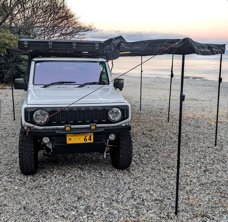 当日は ジムニーに「BLACK EDITION VER.2」を実際に搭載し、さらに「カーサイドタープ200」を装着した状態で展示予定 です。